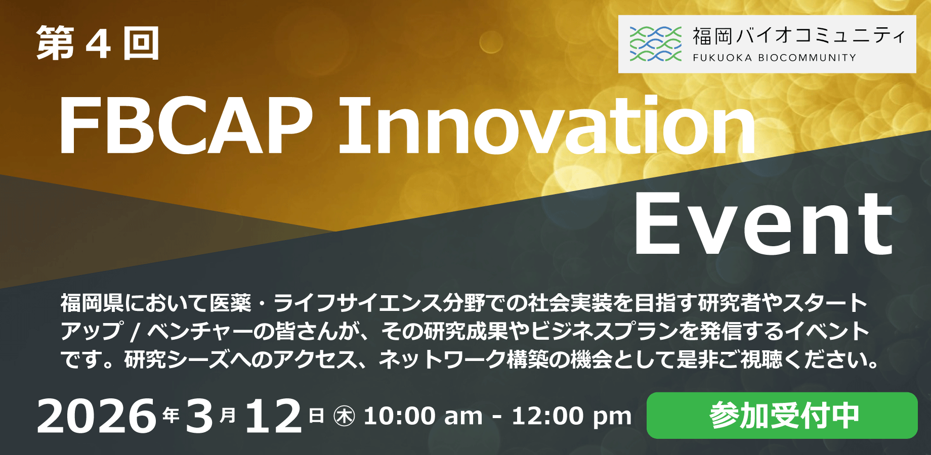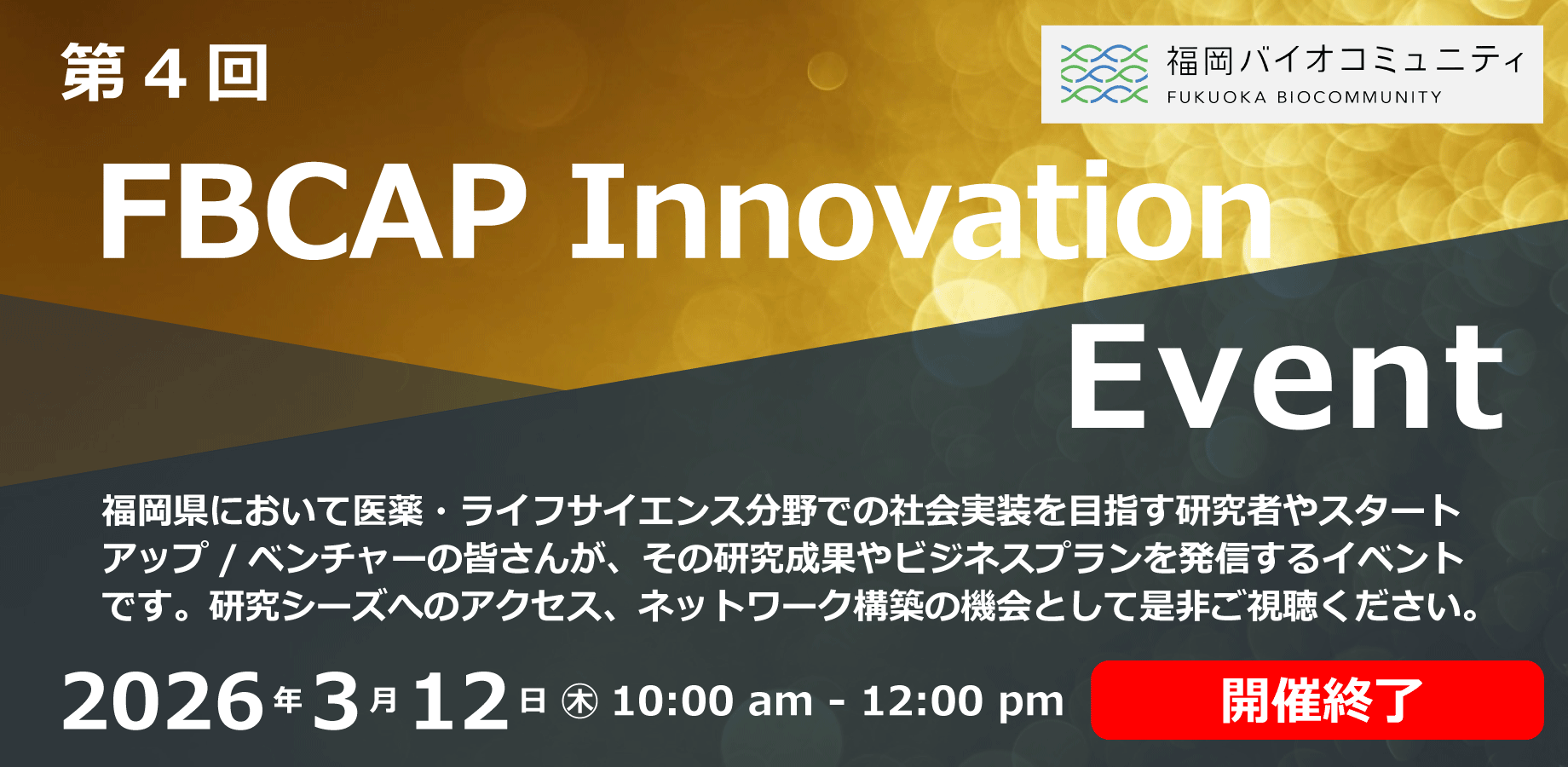 ・第4回 FBCAP Innovation Event (2026年3月12日 開催) 福岡県において医療・ライフサイエンス分野での社会実装を目指す研究者やスタートアップ/ベンチャーの皆さんが、その研究成果やビジネスプランを発信するイベントです。研究シーズへのアクセス、ネットワーク構築の機会として是非ご視聴ください。(視聴参加無料、事前登録制)